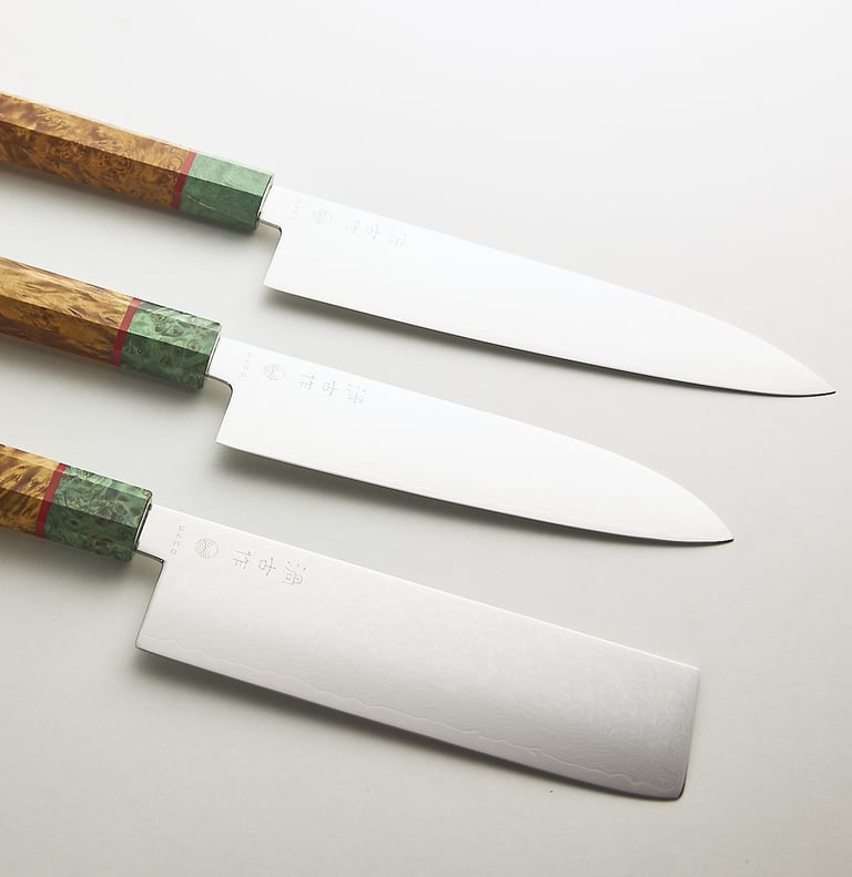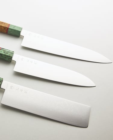 Elegant and modern Knives with Stabilized Birch Wood Handles and a Red G10 Spacer