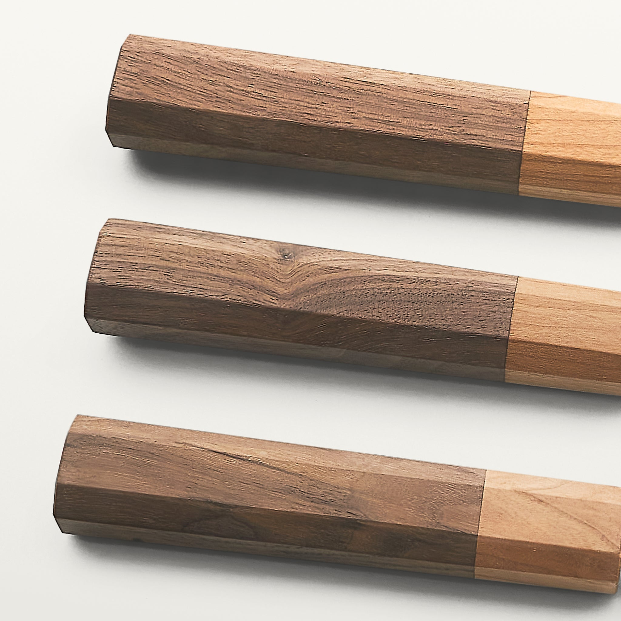 Each handle is crafted from solid wood and finished with a natural food grade oil that enhances the grain while preserving its authentic and distinctive feel.