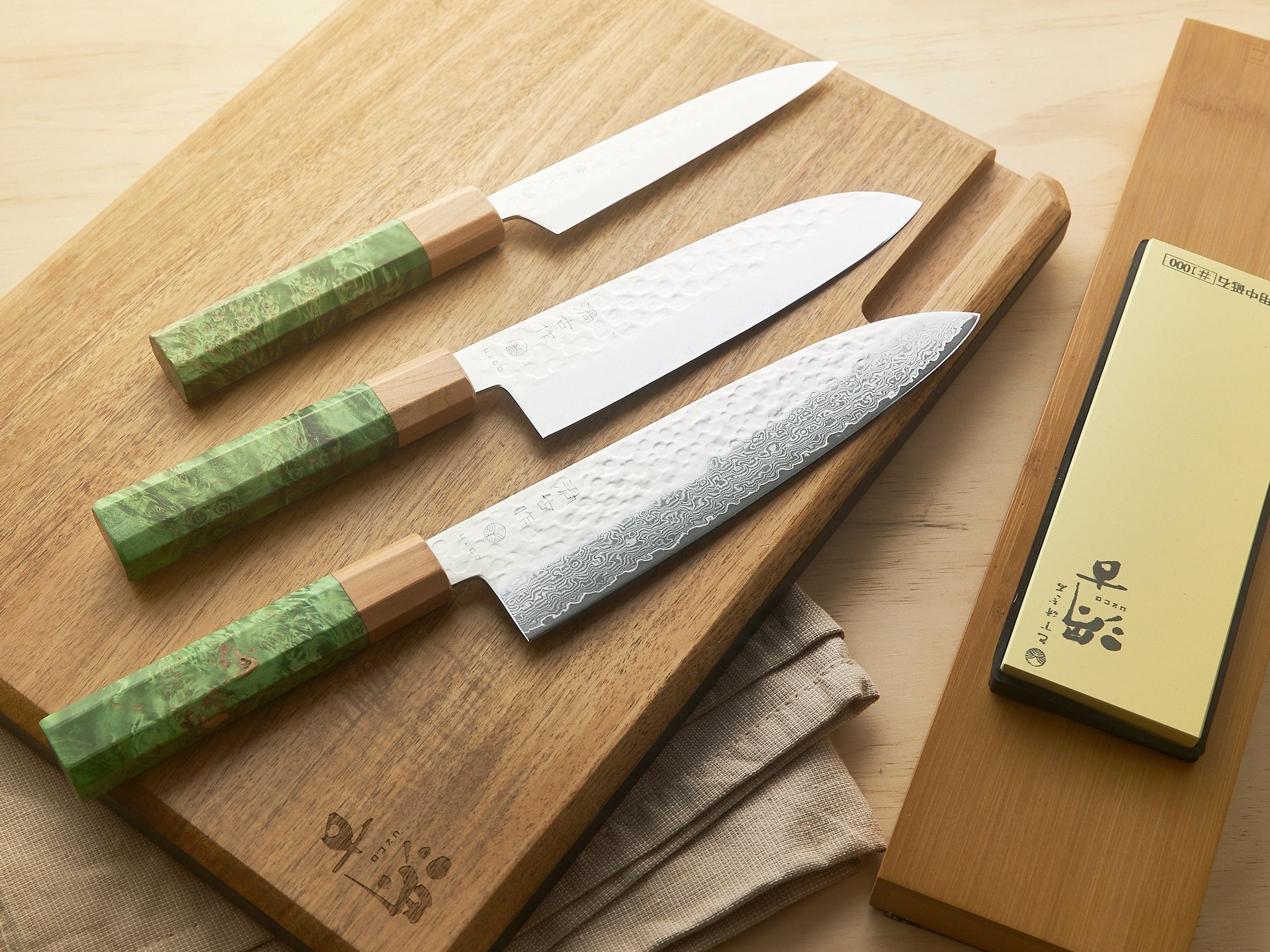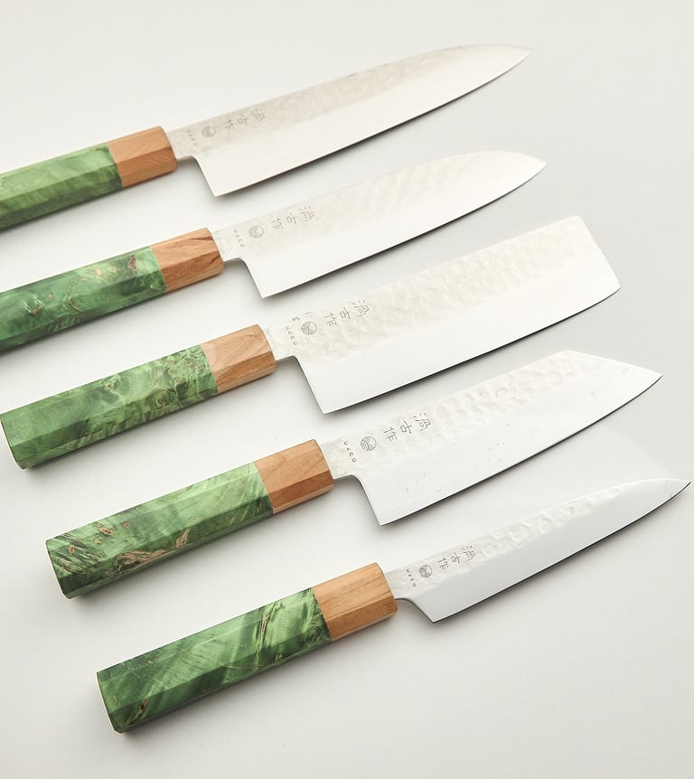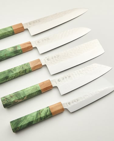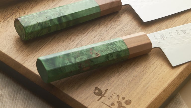 Elegant and modern Knives with Stabilized Birch Wood Handles and a Cherry Wood Bolster